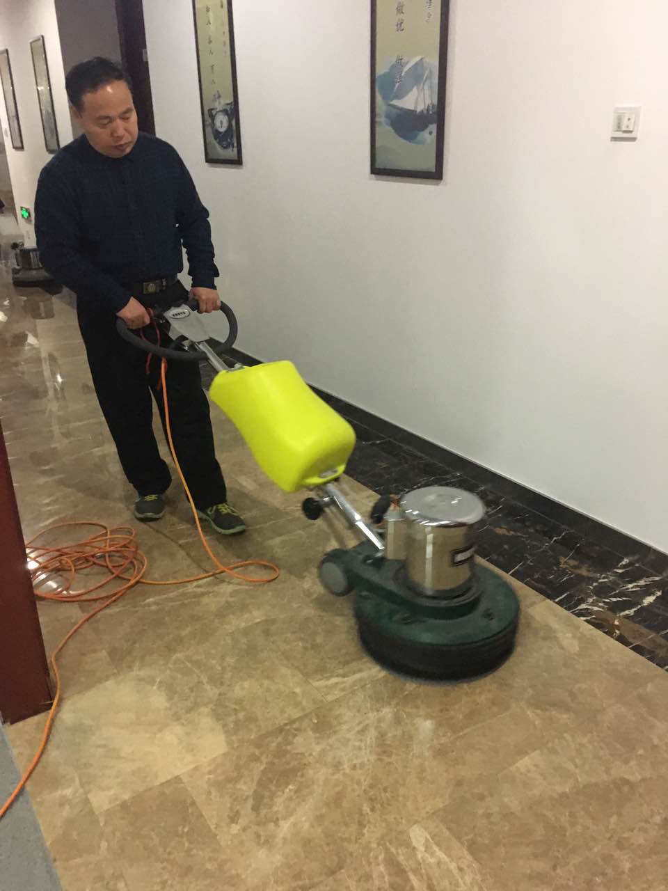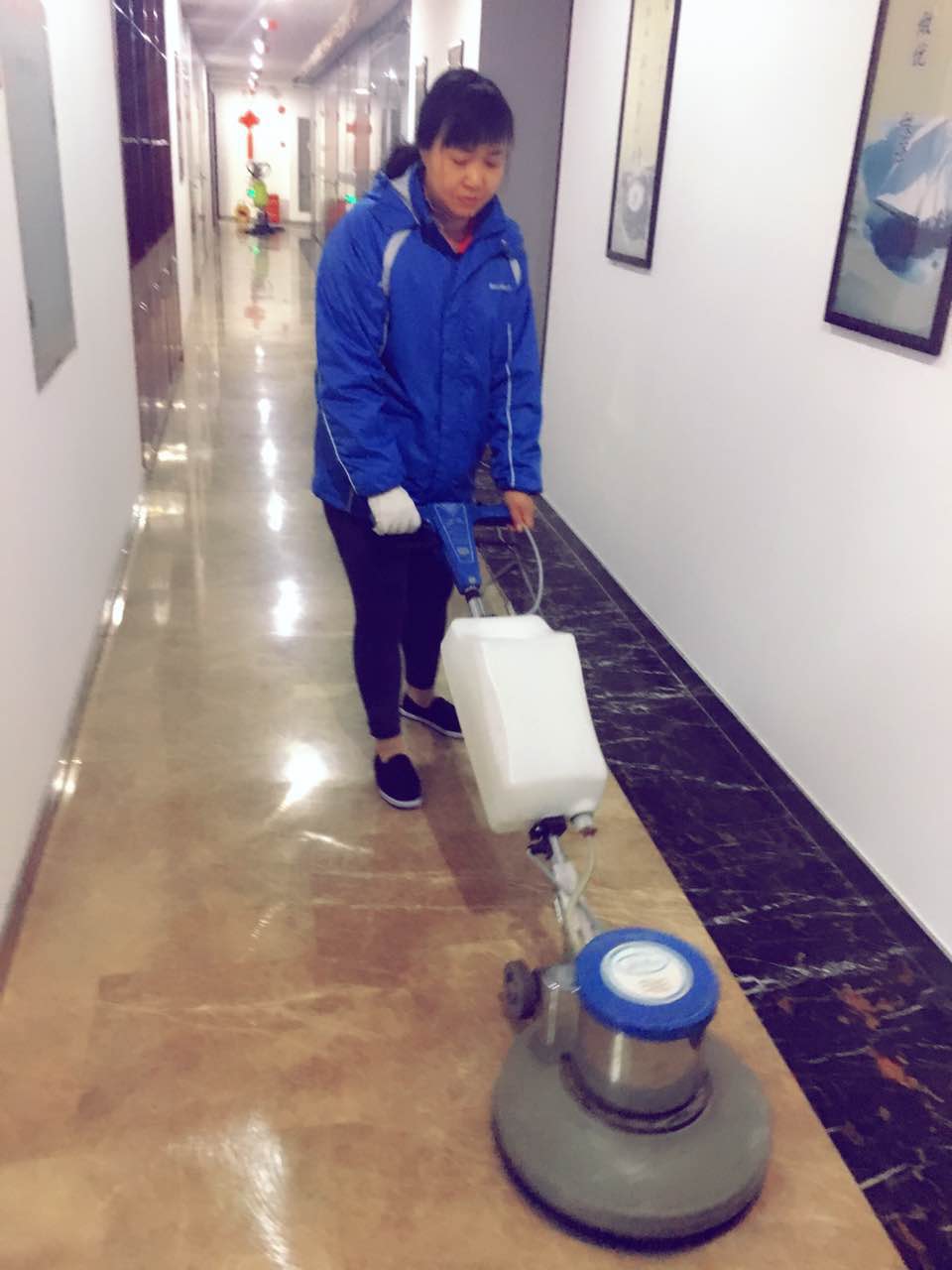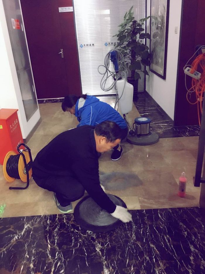 4. 打磨完成后将地面清理干净,开始作精硬处理,先将精硬粉剂适量洒于地面上,再洒上喷 剂,用天然纤维垫以翻新机抛磨至混合干涸状态,如果纤维上积满干硬的混合剂时,就必须另外换一块(每次精硬处理3-4平方米),直到抛磨完成后再 换上干净的不锈钢丝棉垫,喷上少量喷剂,重新全面的抛磨一次。抛磨完后 用地拖拖净地面残留粉剂,石面应立即呈现出坚硬光亮表层。